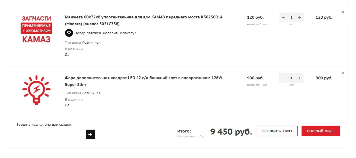 - Загрузите файл - распознанные артикулы добавятся в корзину в требуемом количестве (если необходимого количества нет, то не добавятся, можете перестраховаться и в столбце "Количество" везде проставить 1);